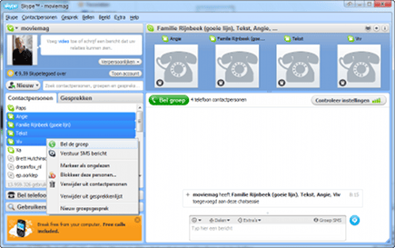 Naast het voeren van een gesprek met één persoon, is het ook mogelijk om een groepsgesprek te voeren met meerdere Skype-gebruikers op pc of smartphone, en daar zelfs mensen aan toe te voegen met een vaste lijn. U kunt in totaal met 25 mensen in een groepsgesprek communiceren. Een groepsgesprek kunt u op drie manieren initiëren. Als eerste kunt u de Shift-toets ingedrukt houden en klikken op alle contactpersonen die u in de groep wilt hebben en vervolgens klikken op Bel groep. Als u al een groep hebt aangemaakt binnen uw contactpersonen, kunt u op deze groep klikken en dan op Bel groep. Besluit u echter tijdens een telefoongesprek dat u een contactpersoon wilt toevoegen, dan klikt u simpelweg rechtsboven op Personen toevoegen. In OS X werkt deze optie wederom iets anders, daar klikt u binnen Skype op Bellen in het menu bovenin en vervolgens op Groepsgesprek. Vervolgens selecteert u de personen die u wilt betrekken in het gesprek. Uiteraard kunt u ook hier nog iemand toevoegen wanneer u al in een gesprek bevindt. U klikt dan op de naam van een persoon in de lijst met contactpersonen, klikt op het uitklapmenu en vervolgens op Aan gesprek toevoegen.