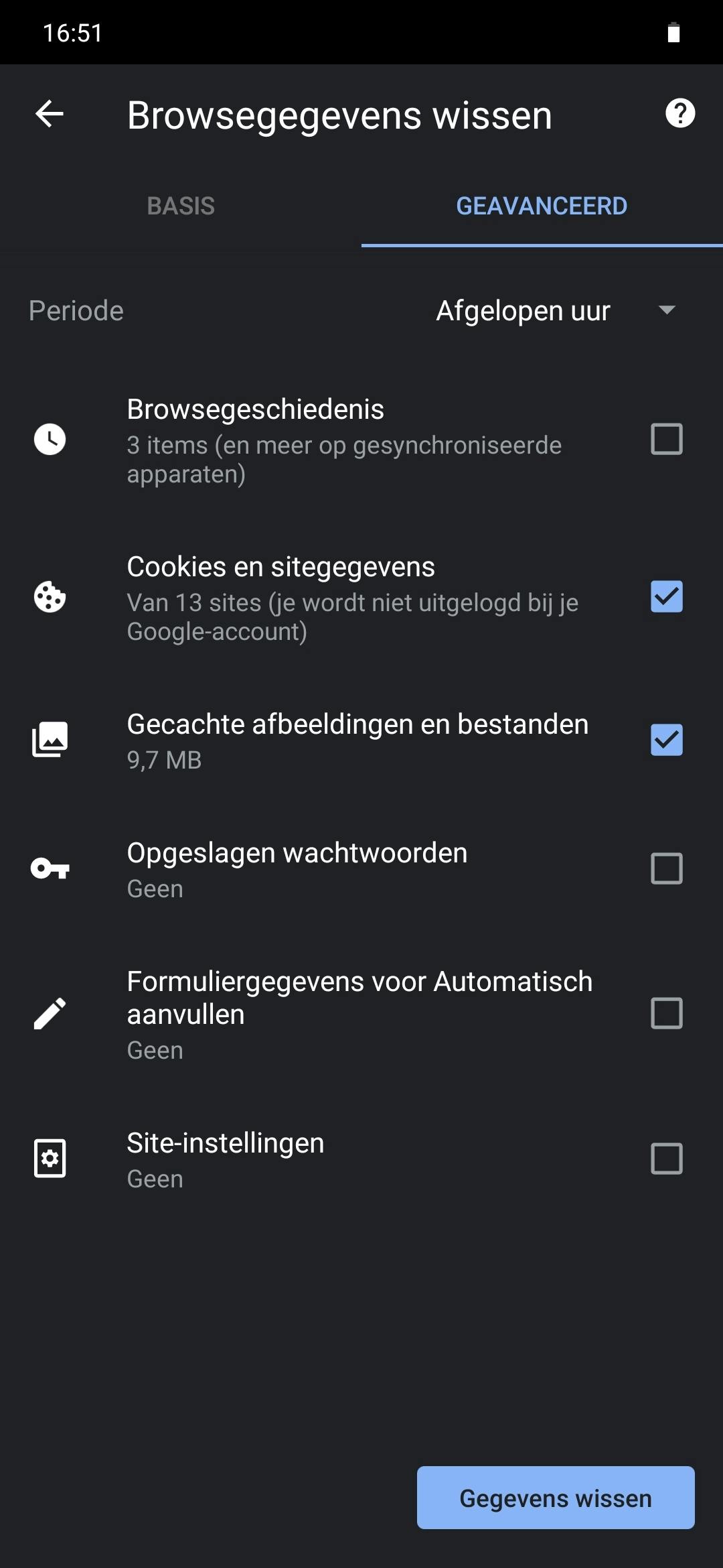 Onder Privacy zie je het kopje Browsergegevens wissen staan. Wanneer je daarop tapt, dan komen er twee tabbladen in beeld te staan: Basis en Geavanceerd. In principe kun je via Basis de cookies verwijderen door Cookies en sitegegevens aan te vinken en rechts onderin op Gegevens wissen te drukken. Maar je kunt dit ook doen door naar Geavanceerd te gaan en daar hetzelfde kopje te selecteren. Eventueel kun je hier ook andere gegevens wissen. Heb je je keuze gemaakt, dan is het de bedoeling dat je een periode aangeeft. Je kunt alles meteen verwijderen of bijvoorbeeld alleen van de afgelopen dag. Houd er rekening mee dat je de gegevens permanent verwijdert.