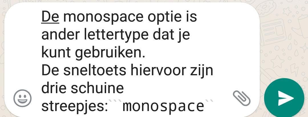 De monospace optie is een geheel ander lettertype dat je kan gebruiken. De sneltoets hiervoor zijn drie schuine streepjes die je normaal op een woord zou zetten zoals deze: ```.