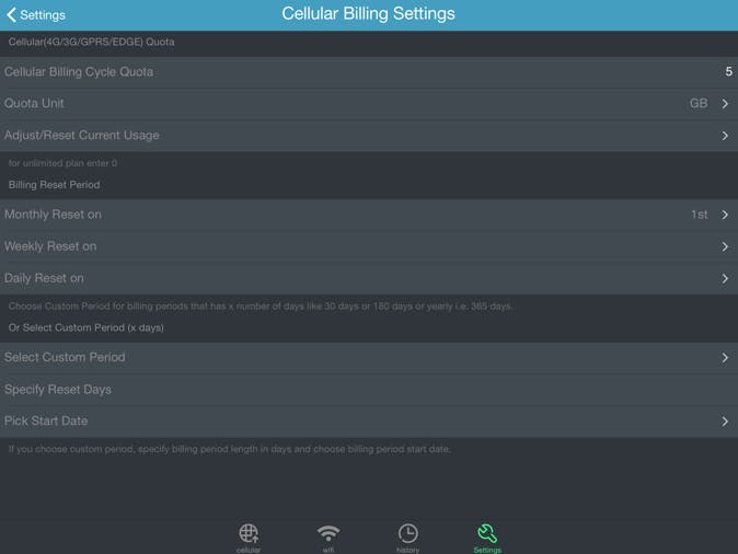 Als eerste moet je de app voeden met wat informatie. Data Usage moet weten wat voor soort databundel je hebt en of deze bundel per maand wordt vernieuwd of na bijvoorbeeld een paar dagen. Tik op de optie Cellular Billing Settings om de gegevens van je databundel in te voeren. Achter Cellular Billing Cycle Quota geef je aan hoeveel megabyte of gigabyte je bundel heeft. Vergeet bij gigabyte niet de optie achter Quota Unit te veranderen in GB. Als je databundel op elke eerste van de maand weer wordt teruggezet, dan kies je bij Monthly Reset on voor de optie 1st. Heb je een databundel voor een week, dan geef je dit aan bij Weekly Reset on. Het kan ook zijn dat je een databundel hebt die bijvoorbeeld tien dagen geldig is. In dit geval kies je Select Custom Period en geef je achter Specify Reset Days het getal 10 aan. Als je een beperkte wifi-bundel hebt, kun je dit ingeven onder WiFi Billing Settings op de vorige pagina.