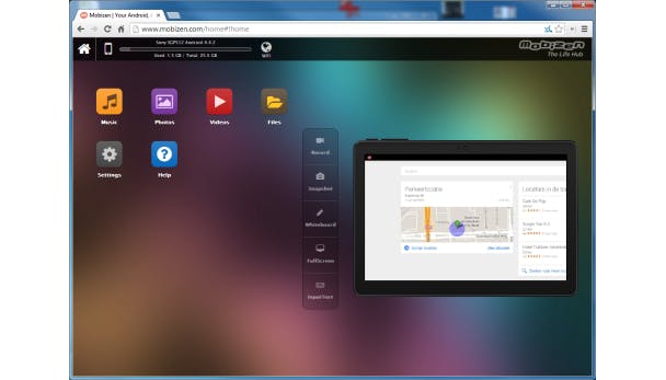 De app Mobizen laat zich behoorlijk vergelijken met AirDroid. Na de installatie log je met een wachtwoord in met de browser van je pc, waarna je je Android op afstand hebt overgenomen. Alle functionaliteit wordt voorgeschoteld in een bureaublad achtige-interface. Je kunt bij je bestanden (waaronder je foto's, muziek en video's) en je ziet hoeveel opslagruimte er is en hoe je Android verbonden is. Extraatje van Mobizen ten opzichte van AirDroid is dat je het Androidtoestel ook direct kunt aansturen. Het beeld wordt gedupliceerd zodat je alles kunt doen alsof je je Android zelf in handen hebt. Minpuntje is wel dat het wat traag werkt. Dus echt fatsoenlijk whatsappen vanaf je pc? Helaas.