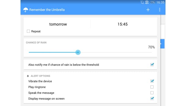 De naam geeft precies de functie van de app weer. Remember the Umbrella zorgt ervoor dat je nooit meer zonder paraplu op pad gaat als het gaat regenen, maar ook dat je niet voor niets een paraplu meeneemt. Je voert in wanneer je van plan bent te vertrekken en de app geeft tijdig aan of je wel of geen paraplu nodig hebt. Je kunt verschillende zaken instellen, bijvoorbeeld bij welk voorspeld neerslagpercentage de app een melding moet geven en wat voor een melding je wilt ontvangen (een bericht, geluid, met of zonder vibratie, etc.). De gratis versie van Remember the Umbrella laat je maar één vertrektijd ingeven. Met de Pro-versie (€ 0,50) kun je meerdere vertrektijden ingeven.
