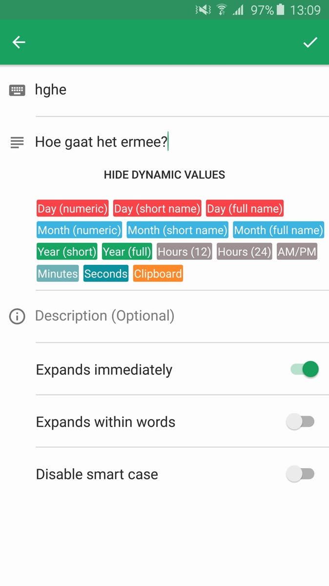 In iOS kun je tekstcorrectie zelf instellen. Bijvoorbeeld om veelgemaakte fouten te voorkomen of door veelgebruikte woorden en zinnetjes makkelijk op te roepen. Met Texpand breng je dit ook naar Android. Je kunt zelf afkortingen maken, die een geprogrammeerd stukje tekst opleveren wanneer ze getypt worden. Je voert bijvoorbeeld hghe in en laat dat automatisch omzetten in 'hoe gaat het ermee?'. Maar je kunt de afkortingen ook aan andere waardes koppelen. Zo kan een afkorting gebruikt worden om de huidige tijd of datum op te roepen, de klembord-tekst te plakken en meer. Wanneer je de afkorting typt verschijnt een pop-up met de suggestie om de geprogrammeerde tekst in te voeren, maar je kunt het ook direct laten gebeuren.