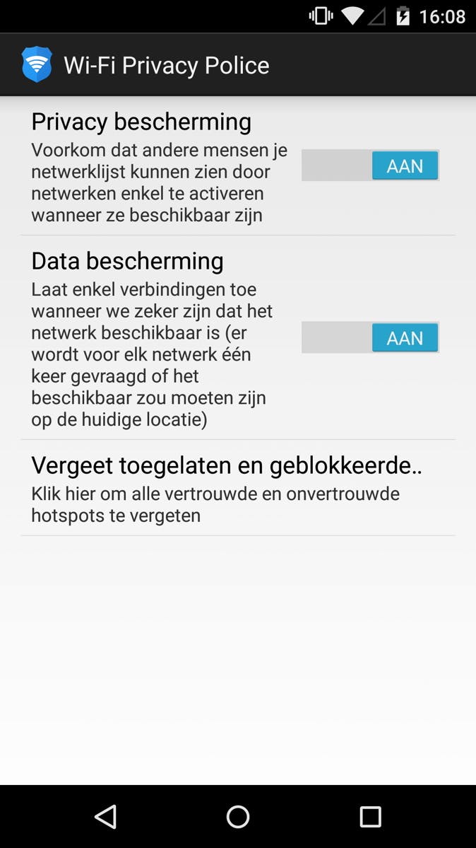 Er zijn een hoop veiligheidsmankementen aan draadloze netwerken. Zo zendt je toestel altijd alle onthouden wifi-netwerken uit wanneer hij op zoek is naar beschikbare netwerken. Ook kunnen valse-wifi hotspots worden nagebootst met dezelfde naam en wachtwoord, zodat toestellen er automatisch verbinding mee maken, waarna veel persoonsgegevens buitgemaakt kunnen worden. Wi-Fi Privacy Police is een app die ontwikkeld is door de universiteit van Hasselt en beschermt je tegen deze twee gevaren. Je wordt om een bevestiging gevraagd als je mogelijk met een imitatie-netwerk verbindt en wanneer je toestel op zoek gaat naar wifi-netwerken, dan worden de onthouden netwerken niet meegezonden. Een handig beveiligings-extraatje.