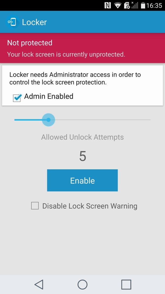 Pas op, Locker is een heel handige, maar gevaarlijke app! Het enige wat de app doet is het wissen van alle gegevens na een bepaald aantal mislukte ontgrendelpogingen, net als bij de iPhone het geval is. Zo kun je je gegevens bijvoorbeeld extra beveiligen bij diefstal. Maar wees dus wel bewust: gewist is gewist. Zorg dus dat je naast Locker altijd een recente back-up hebt, houd je toestel uit de buurt van kinderen en stel voor het geval dat een heel hoog aantal toegestane ontgrendelpogingen in.