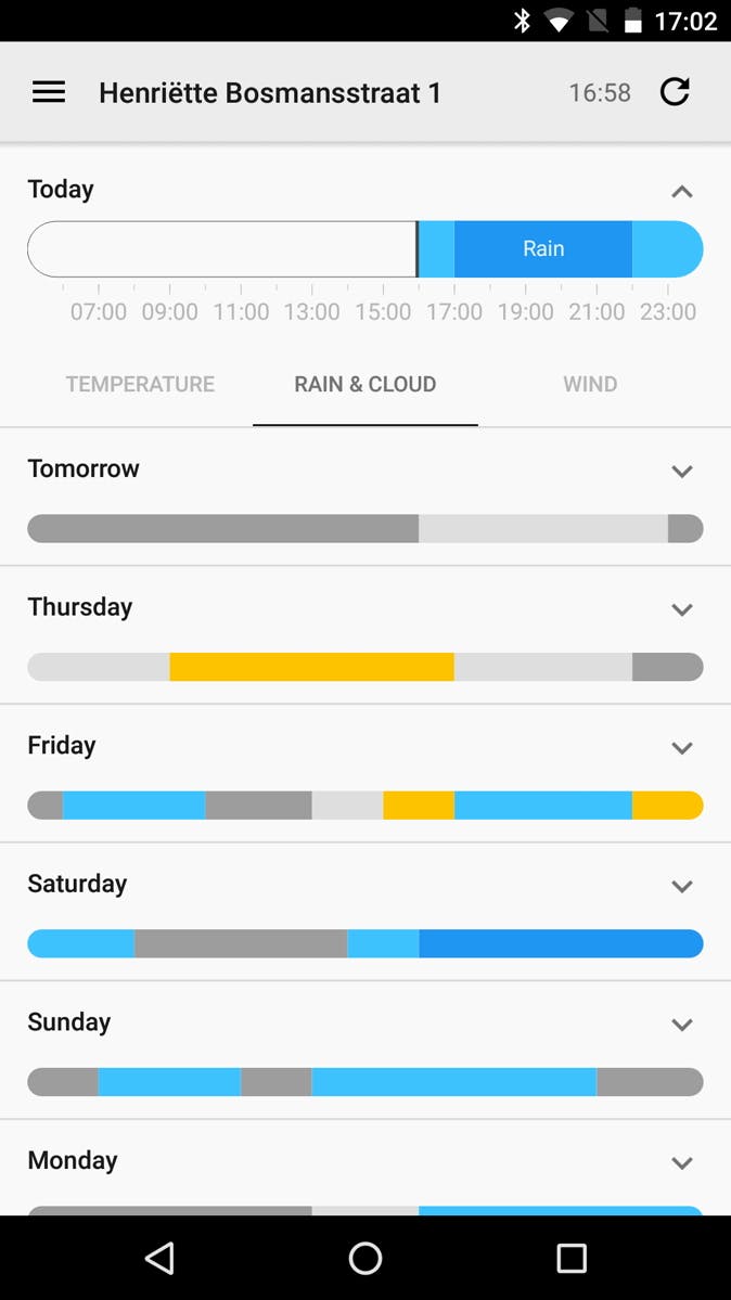 Er zijn zoveel weer-apps, een keuze maken is lastig. Wil je graag een applicatie die overzichtelijk weergeeft hoe het weer de komende dagen is, zonder radars of andere poespas is bij Forecaster aan het goede adres. Er worden 7 balkjes getoond die weergeven hoe het weer de komende week gaat worden. In het balkje zie je op welke momenten van de dag het (hard) gaat regenen, temperatuurverloop en windkracht op jouw huidige locatie of zelf-ingestelde locatie. Veel overzichtelijker krijg je het niet.
