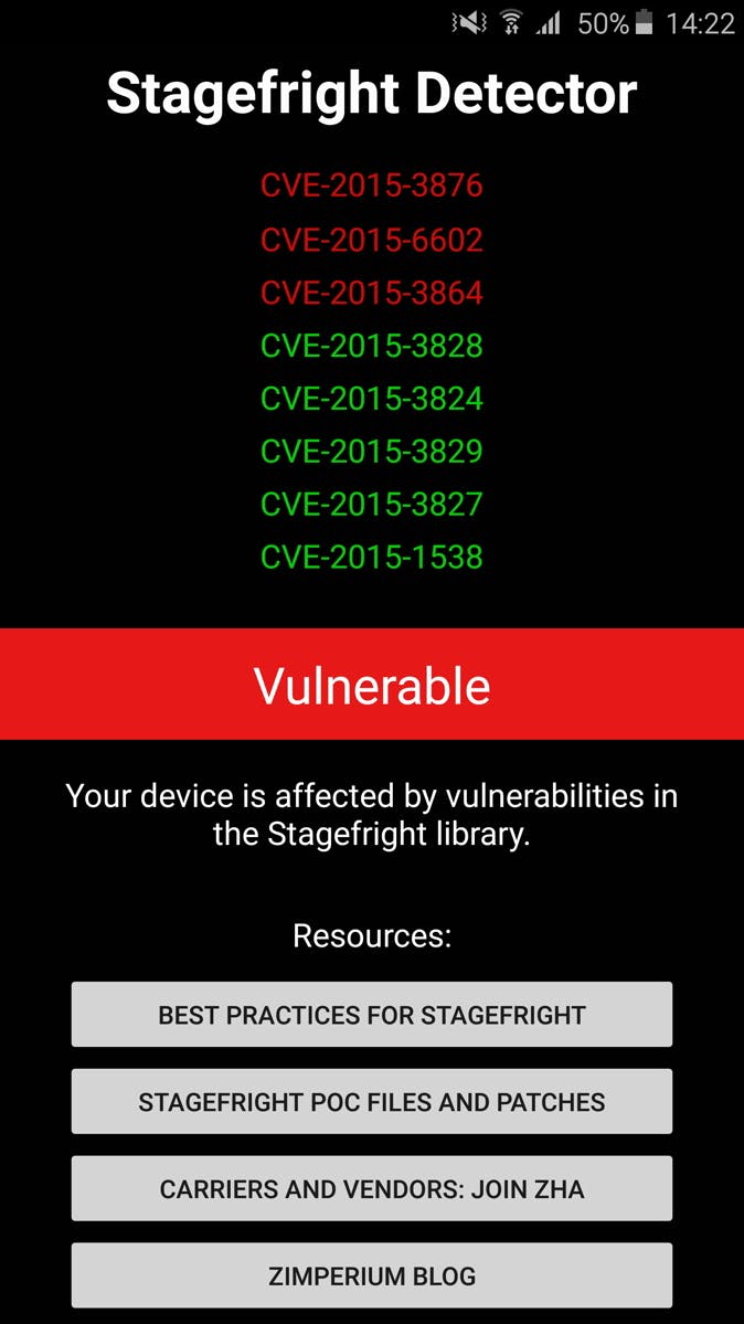 Stagefright is het eerste Android-beveiligingsprobleem dat het voor kwaadwillenden mogelijk maakt om kwaadaardige code uit te voeren op Android-toestellen zonder tussenkomst van de gebruiker. Het lek zit 'm in de MMS-functionaliteit, deze MMS-berichten worden standaard automatisch uitgevoerd. Gelukkig hebben criminelen nog geen methode ontwikkeld om deze kwetsbaarheid uit te buiten, maar omdat veel Android-toestellen geen beveiligingsupdates krijgen blijven ze vatbaar. Het automatisch downloaden van dit soort berichten uitzetten helpt hier al tegen. Maar om even te checken of je toestel kwetsbaar is voor Stagefright gebruik je de app Stagefright Detector.