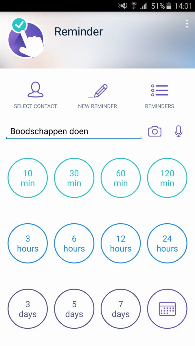 Reminders in de agenda van je Android zetten is nog steeds meer werk dan een paar woorden met pen op de achterkant van je hand. Dat kan efficienter, met ClickMe - Reminder in a click. Je voert de reminder in en bepaalt wanneer je eraan herinnerd moet worden. Eventueel koppel je een contactpersoon of een fotootje aan de reminder en klaar ben je. Je hoeft je handen er niet eens voor te wassen.