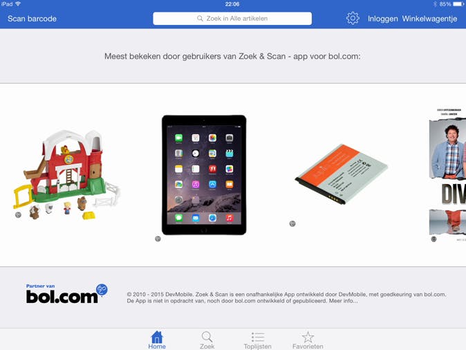 Hoewel Zoek en Scan-app stiekem niet de officiële app van Bol.com is, is het wél een app die is ontwikkeld met goedkeuring van het online warenhuis. Wanneer je de app opent, kun je je afvragen wat er zo prettig aan is, immers, je hebt niet eens een fijne lijst met categorieën om doorheen te bladeren. Dat klopt, maar in plaats daarvan kun je wél streepjescodes scannen van producten die je elders in winkels vindt, om te zien of ze wellicht bij Bol.com goedkoper zijn.