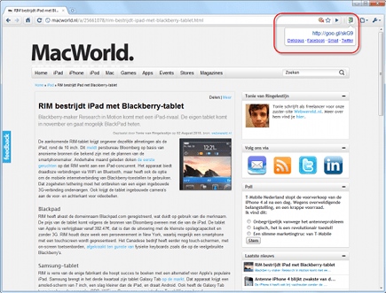 Dankzij miniblogs als Twitter, waarbij u slechts een beperkt aantal karakters kunt gebruiken per bericht, zijn url-inkorters in korte tijd erg populair geworden. Jarenlang was TinyURL.com de onbetwiste marktleider op dit gebied, vandaag de dag worden concurrenten als bit.ly en u.nu veel vaker gebruikt. Recentelijk heeft ook Google zich in deze markt gestort, met een eigen url-inkorter. Met de extensie goo.gl URL Shortener kunt u met een druk op de knop in de menubalk lange url's omzetten en direct gebruiken in diverse online diensten en e-mail, die u kunt selecteren via de configuratiepagina.