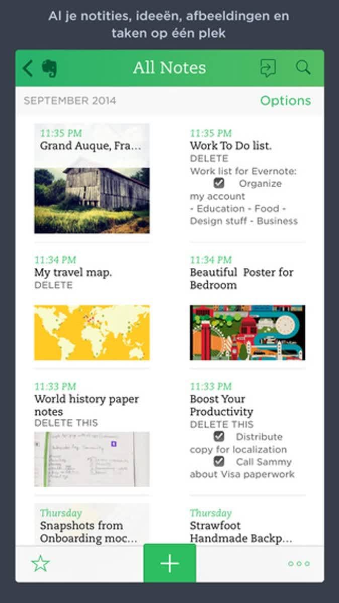 Evernote is waarschijnlijk de meest bekende notitie-app in de App Store. Dit is een softwarepakket waarmee je meer opties hebt dan je waarschijnlijk zelf zou kunnen bedenken. Je kunt simpelweg notities maken, maar je kunt ook handig stukken van webpagina's knippen en plakken en daar je notities bij maken. Plak er dan rustig een stuk van een andere webpagina bij en bouw zo je research.
