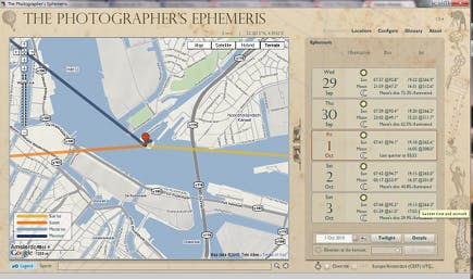 Download The Photographer's Ephemeris. Dit programma is ontwikkeld voor de landschapsfotograaf die alles wil weten over de zon- en maanstand en het tijdstip waarop de schemering invalt. Voor fotografen zijn dergelijke gegevens essentieel, omdat ze veel invloed hebben op de belichting. Op de genoemde website klikt u op het programmalogo onder Download. Na een korte installatieprocedure start het programma automatisch. Doordat Google Maps is ingebouwd, kunt u direct naar de gewenste fotolocatie navigeren. In het rechterscherm vindt u onder het tabblad Emphemeris allerlei gegevens, zoals data en tijden. Bij iedere term kan desgewenst uitleg worden gegeven. Als u bijvoorbeeld niet weet wat 'Last quarter at 05:52' betekent, kunt u op dat zinnetje klikken, waarna er een uiteenzetting over de maanstanden op uw scherm verschijnt.