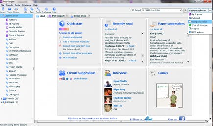 Het programma Peaya Paper is een uitgebreide managementapplicatie voor documenten zoals PDF's. U kunt zulke documenten rechtstreeks zoeken via websites als Google Scholar of Web of Science. Ook lokaal opgeslagen PDF's kunt u in het programma invoeren, om er extra gegevens op detailniveau aan toe te voegen. Vervolgens kunt u de documenten importeren en delen via e-mail, Facebook of Flickr. De belangrijkste onderdelen van een tekst kunnen uit het document worden gehaald en apart worden opgeslagen. Bovendien kunt u uw werkomgeving delen met (studie)collega's die vervolgens op- en aanmerkingen kunnen geven op uw documenten, en die andere artikelen kunnen aanbevelen. Peaya Paper is daarom een ideaal hulpmiddel voor wie in groepsverband onderzoek doet, op welk niveau dan ook. Om optimaal gebruik te maken van de mogelijkheden is het aanmaken van een account vereist. U downloadt de software vanaf Peaya Paper. Klik op Download en vervolgens op Install now. Op Peaya Paper vindt u een uitgebreide handleiding van het programma.