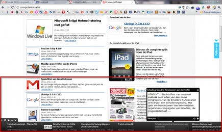 Snackr toont een lopende 'breaking news'-balk, onderin, aan de zijkant of bovenin uw scherm. Het kleine programmaatje is in de loop der jaren een begrip geworden onder AIR-gebruikers, omdat het handig en enorm gebruiksvriendelijk is. Surf naar Snackr en klik op Install now. Als deze procedure is afgerond, wordt een welkomstscherm geopend waarin u handmatig RSS-links kunt invoegen. Als een website beschikt over een RSS-feed, herkent u dit meestal aan een oranje logo met twee witte strepen. U voegt zo'n pagina aan Snackr toe door de url ervan in te voeren. In hetzelfde welkomstscherm kunt u er ook voor kiezen om al uw nieuwsberichten uit Google Reader automatisch te laten importeren. Als u alles naar wens hebt ingevoerd, loopt er voortaan een nieuwsbalk door uw beeld. Door op een getoonde titel te klikken, wordt er een minischerm geopend met de intro van de betreffende tekst. In dit minischerm kunt u vervolgens doorklikken naar de website waarop het volledige bericht staat. Die site wordt dan overigens wel in een normale webbrowser geopend.