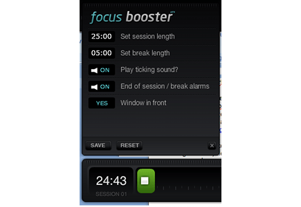 Aanhangers van de Pomodoro-gedachte zijn 25 minuten effectief aan het werk, om vervolgens 5 minuten pauze te houden. Volgens de bedenker van deze methode blijven werknemers die dit schema volgen een stuk fitter en frisser. Wie het ook eens wil proberen, kan Focus Booster installeren. Dit programma haalt u binnen door te surfen naar fb Focus Booster en daar op de knop Download te klikken. Na installatie nestelt zich een lange zwarte lange balk in uw beeld, met een klok die standaard op 25 minuten is ingesteld. Als u op de groene Play-knop klikt, begint de tijd te lopen. Na iets minder dan een half uur rinkelt er een alarm, om u erop te attenderen dat het tijd is voor uw minipauze. Om in het instellingenvenster van Focus Booster te komen, klikt u op het i-logo. Door op de tijd te klikken en de muis naar links of naar rechts te verschuiven, past u de intervallen van de werk- en pauzesessies aan. Vergeet niet op Save te drukken om uw instellingen op te slaan.