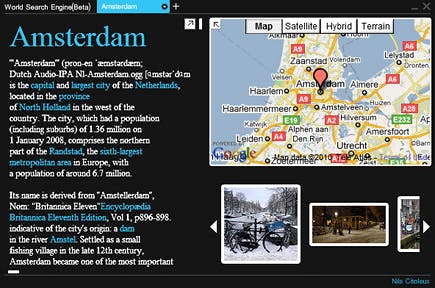 De applicatie World Search Engine zet een klein venster op uw bureaublad, waarmee u locaties over de hele wereld kunt opzoeken. Als u bijvoorbeeld 'Amsterdam' als opdracht intikt, levert dat een uitgebreide Wikipedia-pagina over deze stad op, terwijl het rechterdeel van het scherm Google Maps en afbeeldingen uit Flickr en Panoramio laat zien. Als u op een afbeelding klikt, vult de betreffende foto het volledige scherm. Helaas kent het programma geen extra functies, zo is het opslaan van informatie en foto's bijvoorbeeld niet mogelijk. Door een aantal populaire websites te combineren, levert het programma uiteindelijk niet veel meer informatie dan de basisfuncties van Google Earth. World Search Engine heeft echter als voordeel dat het veel sneller werkt. U vindt het programma op de website van Adobe.