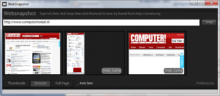 Download Websnapshot, een applicatie waarmee u screenshots kunt maken van een volledige website. Slechts een klein onderdeel van een webpagina in het shot opnemen is ook mogelijk. Als u het programma na installatie opent, kunt u de url van de vast te leggen webpagina in het witte tekstvak typen. Daarbij kan http:// achterwege worden gelaten. Klik vervolgens op Thumbnail (kleine afbeelding), Browser (wat u zou zien in een normaal scherm) of Full page (waarmee de gehele website van boven tot onder als afbeelding wordt opgeslagen). Klik ten slotte op Snap en het screenshot wordt op uw bureaublad geplaatst. Deze locatie kan worden aangepast via Preferences, dat u rechtsonder in het venster vindt.