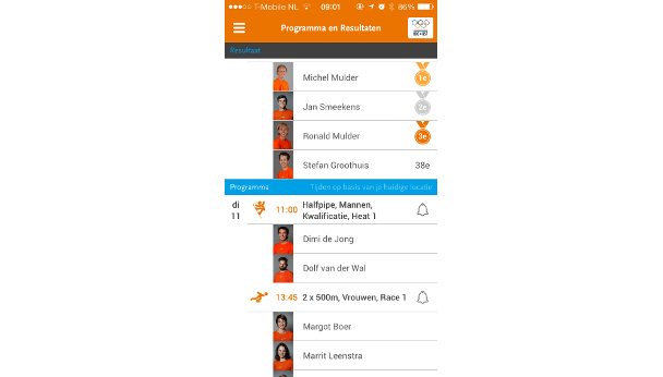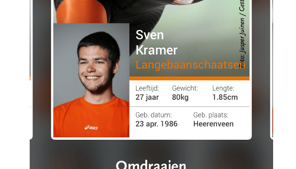 Kies je voor het volledige overzicht van alle onderdelen die voor Nederland op stapel staan, dan kun je per onderdeel een push-alert instellen, zodat je een melding krijgt vlak voordat het onderdeel begint. Bij ieder onderdeel zie je een pasfoto van de atleet die deelneemt. Druk je op zo'n pasfoto dan verschijnt er iets dat nog het meest lijkt op een interactieve baseball card, met daarop foto's, informatie over de atleet en soms zelfs nog een introductievideo.
