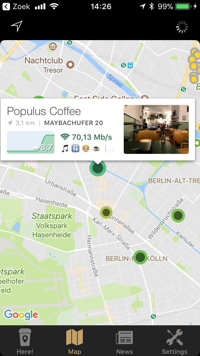 Dat roamen binnen Europa nu geen extra kosten meer met zich meebrengt (ten opzichte van je Nederlandse bundel) is natuurlijk extreem handig, maar het kan alsnog handig zijn om te weten waar het dichtstbijzijnde gratis wifi-netwerk zich bevindt. Hiervoor zijn een paar apps beschikbaar. De app Café Wifi focust zoals de naam al aangeeft vooral op cafés. Je tikt op Map en ziet in één oogopslag cafés, bars en restaurants die gratis wifi aanbieden. De snelheid van het wifi-netwerk wordt bij veel opties ook genoemd en aan de hand van icoontjes weet je wat voor andere voorzieningen er in het café te vinden zijn. De app is nu nog alleen voor iOS verkrijgbaar, maar Android volgt binnenkort. Voor Android kun je de app WiFi Finder gebruiken, deze is overigens ook in de App Store van iOS te vinden.