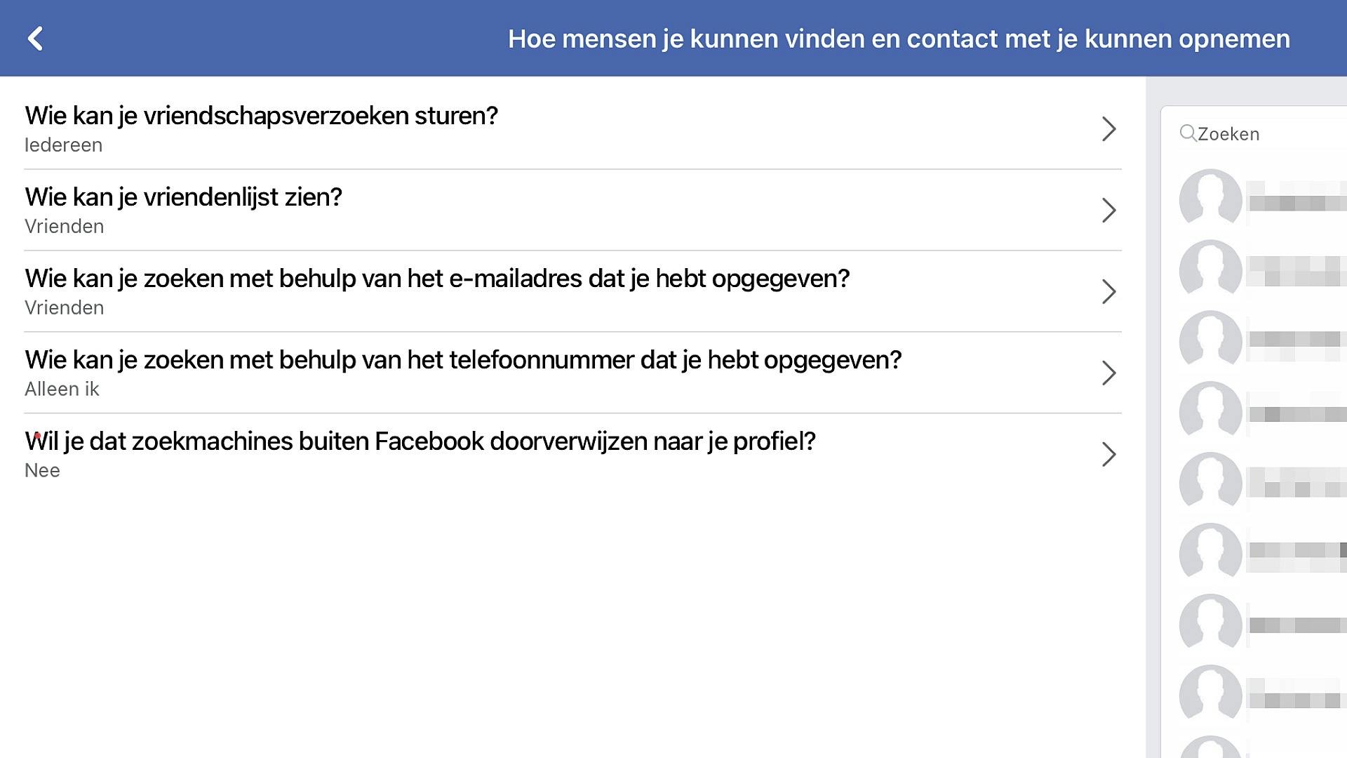 Klik op < linksboven in beeld om terug te keren in het instellingenmenu, dat werkt bij alle genoemde opties. Klik onder Doelgroep en zichtbaarheid op Profielgegevens. Ons advies: vul hier zo min mogelijk in en verwijder wat niet noodzakelijk is voor het functioneren van je account. Tik op < en dan op Hoe mensen je kunnen vinden en contact met je kunnen opnemen. Kijk heel kritisch naar de hier beschikbare opties. Wil je zelf de regie zoveel mogelijk in de hand houden, zet dan alle opties – waar mogelijk – op Vrienden. En kies voor Nee bij de optie Wil je dat zoekmachines buiten Facebook doorverwijzen naar je profiel? Zo vinden mensen van wie je liever niet hebt dat ze je vinden je nooit, inclusief een eventueel net iets te nieuwsgierige baas. Overigens: alle reacties die je onder posts van anderen plaatst - en zeker berichten van derden zoals bijvoorbeeld nieuwssites - zijn altijd door iedereen leesbaar! Ook als je lid bent van groepen, zijn daar geplaatste berichten door iedereen in die groep te lezen, vriend of niet. Betreft het een openbare groep, dan kan wederom iedereen meelezen, ongeacht de geselecteerde restricties.