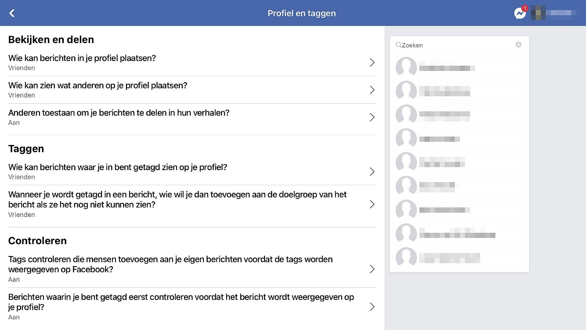 Tik op < en daarna op Profiel en taggen. Hier kun je bijvoorbeeld aangeven wie er berichten op je wall mogen plaatsen, maar ook het hele ietwat vervelende tag-gedoe beheersen. Doorloop alles eens rustig en stel zoveel mogelijk in op Vrienden. Dat zijn immers de mensen waar je dingen mee wilt delen en – waarschijnlijk – niet met de rest van de wereld. Net zo min als je wilt dat anderen jouw persoonlijke gedeelde zaken ongebreideld wereldwijd delen.