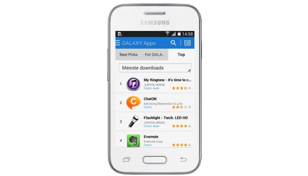 Doorgaans heeft Samsung er een handje van de Galaxy-smartphones en -tablets te overspoelen met extra apps en diensten. Dat valt gelukkig wel mee als we naar de Young 2 kijken. Daardoor houd je bijna 1,8 GB over voor eigen apps en bestanden. Dat is alleszins redelijk. Je eigen apps haal je natuurlijk uit de Play Store van Google, maar er is ook een Samsung Apps-applicatiewinkel. Het aanbod voegt echter niks toe; je smartphone is beter af zonder.