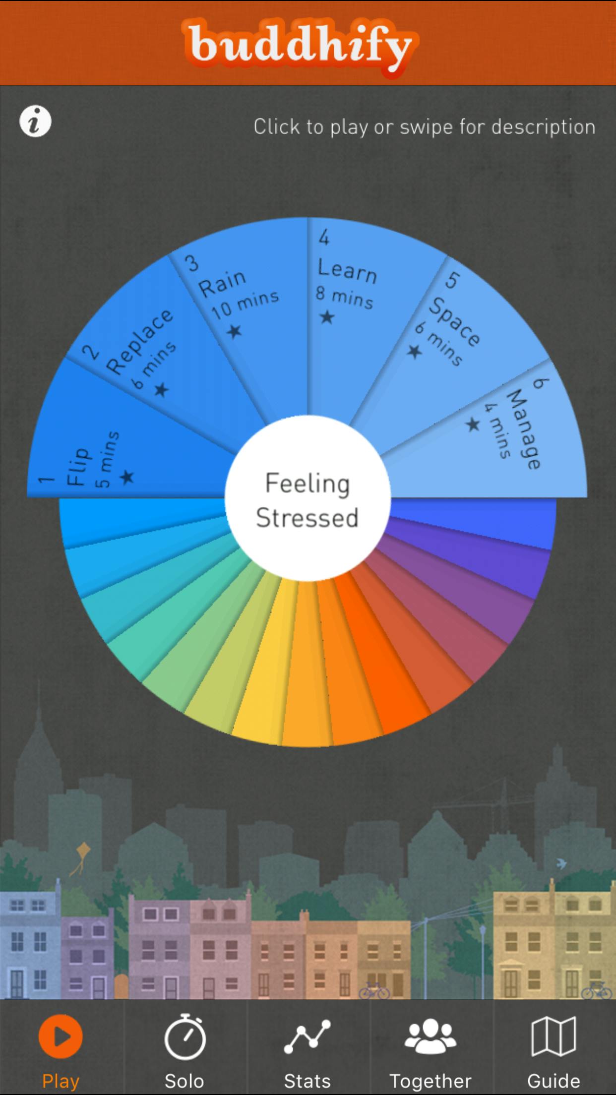 De app Buddhify (Android en iOS) is ontworpen om je tijdens dagelijkse gebeurtenissen of gevoelens te helpen ontspannen. Het scherm toont een gekleurd rad, waarop je de balk aanraakt die beschrijft wat voor jou op dit moment het meest van toepassing is. Bijvoorbeeld ‘Feeling stressed’, ‘Can’t sleep’ of ‘Work break’. Vervolgens stelt de app een aantal meditaties voor, met verschillende tijdsduren. Zo kun je snel een oefening zoeken die het beste bij je behoefte past. Vervolgens start een gesproken begeleiding, die je in het Engels door je meditatie praat. Het prettige van deze app is dat je voor 4,99 euro alle meditaties in één keer aanschaft, en dus niet meteen tegen in-app-aankopen aankijkt. Dit is een plezierige uitzondering tussen de meeste andere mindfulness-apps.