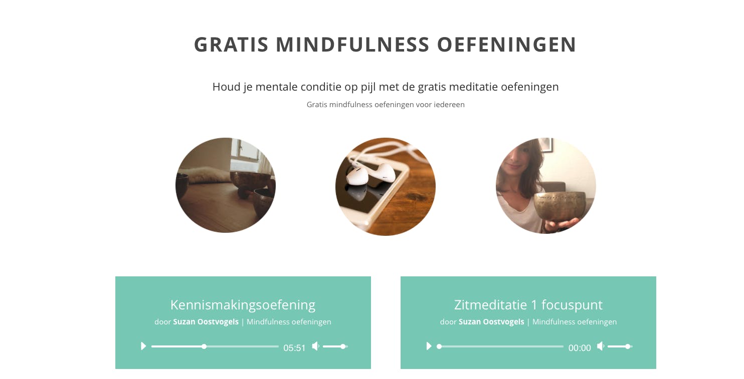 Aangezien de basis van mindfulness bestaat uit een geleide meditatie, is het niet vreemd dat dit soort gesproken oefeningen ook als mp3-bestanden beschikbaar zijn. Diverse sites bieden oefeningen aan, gratis of tegen betaling. Op www.mindfulcentrum.nl kun je een aantal gratis Nederlandstalige sessies afspelen, waarmee je achter je computer de oefeningen kunt doen. De oefeningen doen niet onder voor de betaalde sessies die we in sommige apps tegenkwamen en de stem van meditatiebegeleidster Suzan Oostvogels is prettig om naar te luisteren. De site werkt ook op mobiele browsers, wat het makkelijk maakt om de langere oefeningen bijvoorbeeld op bed te luisteren.