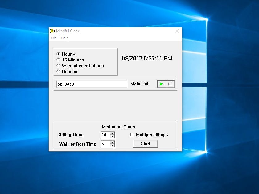 In de Boeddhistische traditie van Thich Nhat Hanh is het gebruikelijk dat je bij het horen van een bel even stopt met waar je mee bezig bent en je dan minstens drie diepe ademhalingen op jezelf concentreert. De gratis Windows-app Mindful Clock laat je op regelmatige intervallen (bijvoorbeeld elk uur) een bel horen, waarop je even een meditatiemoment inlast. Je kunt zelf de intervalduur kiezen en indien gewenst het geluid van de bel door iets anders vervangen. Ook is er een eenvoudige meditatietimer. Het is heel minimalistisch, maar prima om jezelf er even aan te herinneren dat je niet de hele dag alleen maar naar je scherm moet staren.