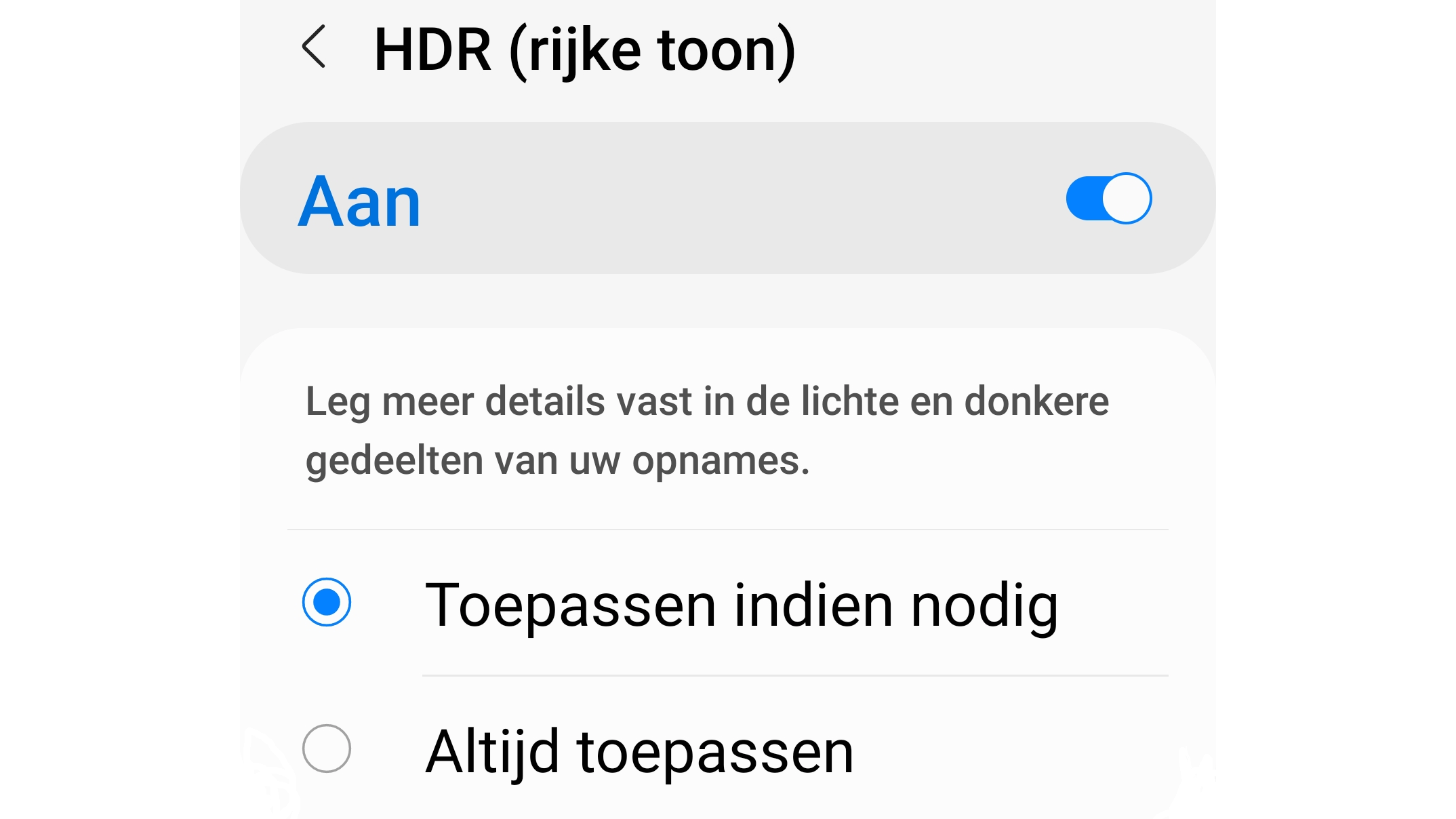 Ondersteunt je camera-app HDR, dan kun je hiermee de belichting optimaliseren bij hoog contrast tussen lichte en donkere gebieden. Dit is bijvoorbeeld nuttig bij landschappen met zonsopgang of zonsondergang, stadsgezichten en portretten met tegenlicht. HDR maakt meerdere opnamen van dezelfde scène met verschillende belichtingsinstellingen en sluitertijden, waarna deze worden gecombineerd op basis van de beste belichting van elke opname. Gebruik HDR niet bij scènes met weinig contrast of bij bewegende objecten.