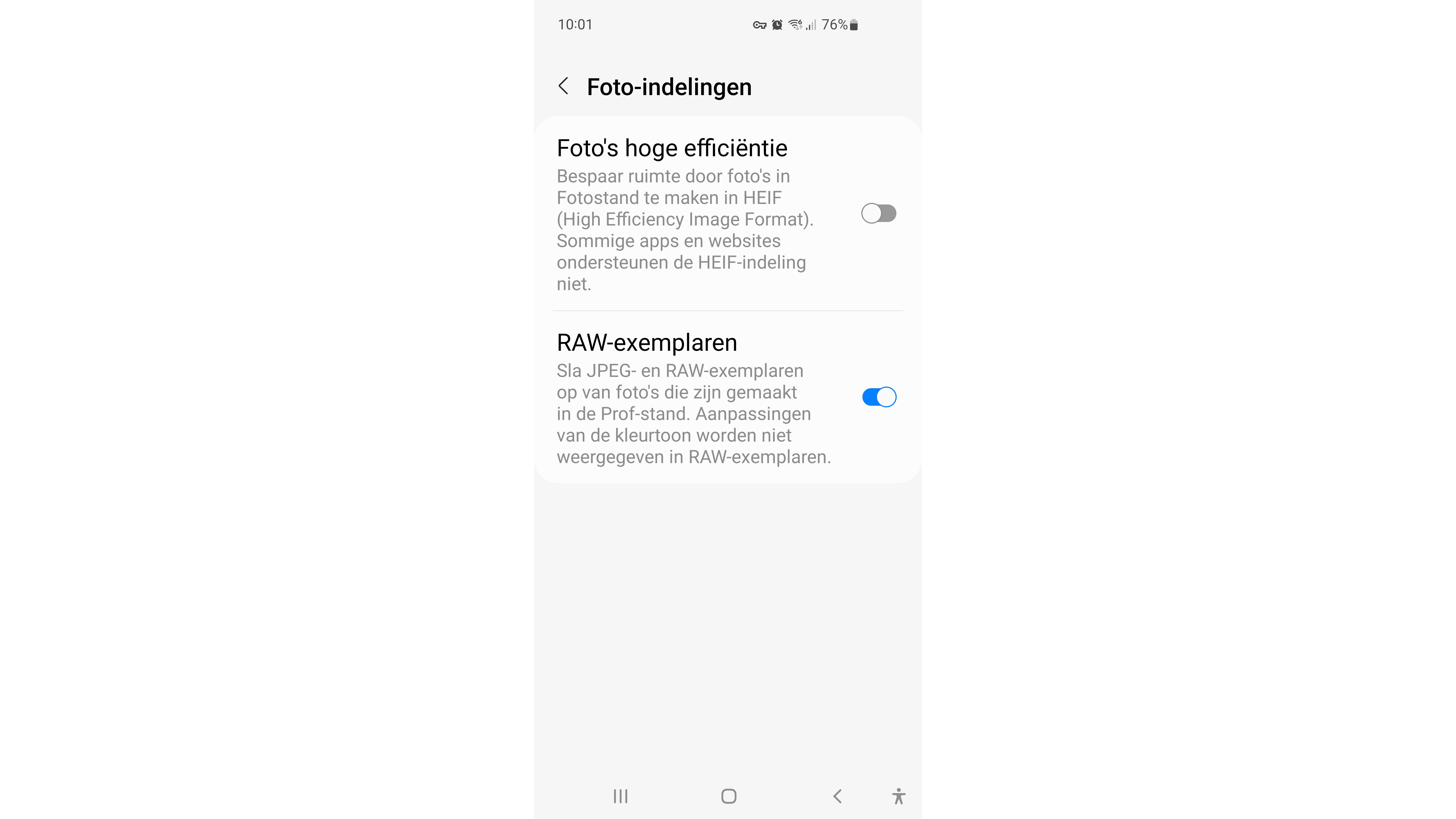 Sommige apparaten en camera-apps als Camera+, Pro Camera en ProShot, laten je foto’s in raw-formaat bewaren. Raw slaat de onbewerkte gegevens van de camerasensor op, inclusief licht- en kleurinformatie, zonder kwaliteitsverlies. Bij een raw-bestand kun je achteraf schaduwen helderder maken en kleuren optimaliseren zonder extra ruis. Het kan soms even zoeken zijn om in raw op te slaan. Bij een oude Samsung Galaxy S10 bijvoorbeeld veeg je naar links, kies je Pro, tik je op het tandwielpictogram en schakel je bij Foto-indelingen de optie RAW-exemplaren in. Bedenk wel dat raw-bestanden veel omvangrijker zijn dan gecomprimeerde jpeg’s.