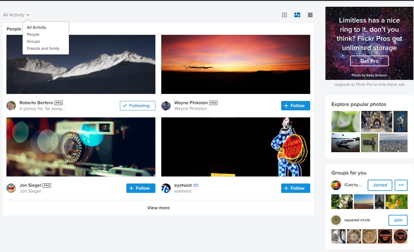 Maak je veel foto’s, dan wil je ze misschien ook delen. Een foto-community zoals Flickr biedt je niet alleen tools voor het uploaden, organiseren en beheren van je foto’s, maar heeft ook een levendige community van fotografen. Er zijn forums en je kunt deelnemen aan groepen die bij je interesse aansluiten om feedback te krijgen en ervaringen te delen. De betaalde Pro-versie (circa 6 euro per maand) verwijdert advertenties, biedt onbeperkte opslag voor je foto’s en video’s, en geeft geavanceerde statistieken over wie je foto’s bekijkt.