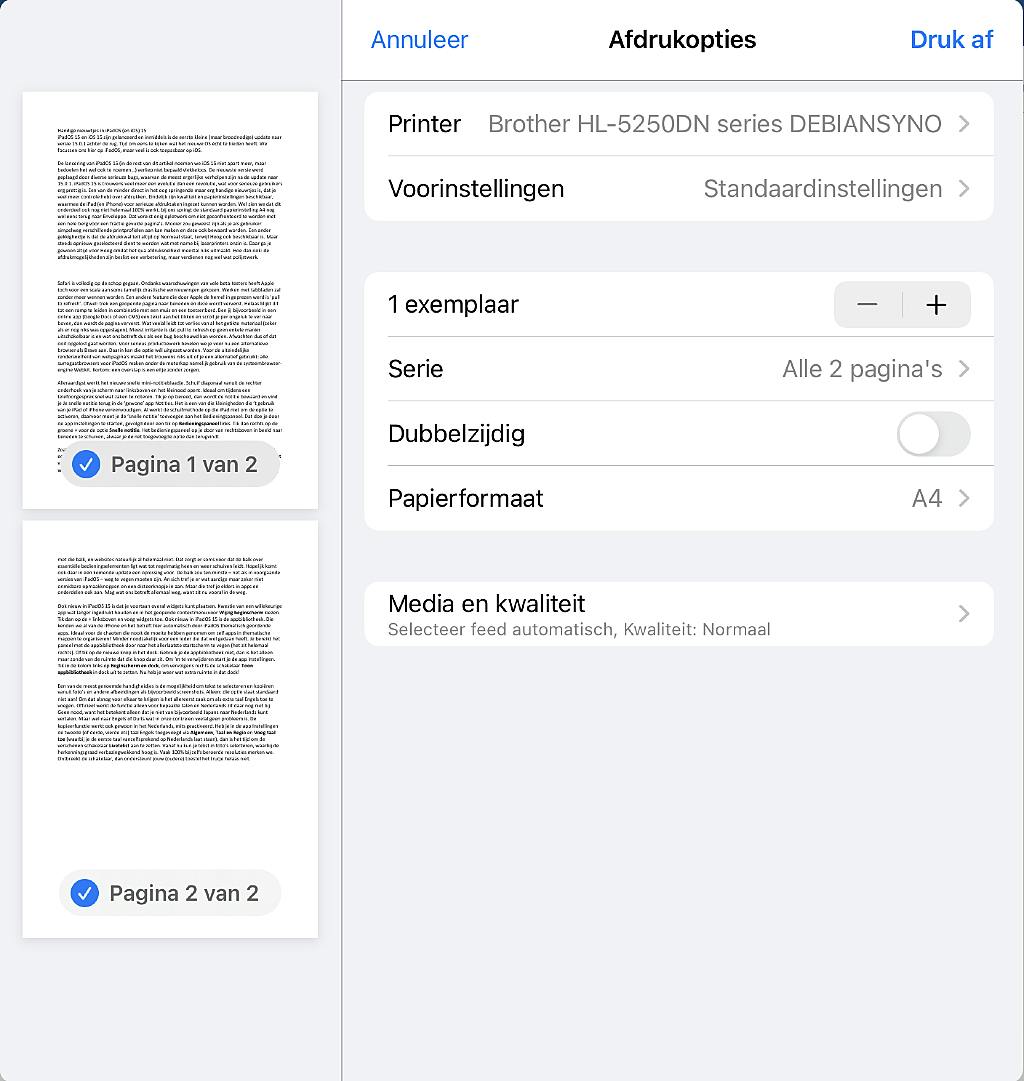 De lancering van iPadOS 15 (in de rest van dit artikel noemen we iOS 15 niet apart meer, maar bedoelen het wel ook te noemen…) verliep niet bepaald vlekkeloos. De nieuwste versie werd geplaagd door diverse serieuze bugs, waarvan de meest ergerlijke verholpen zijn na de update naar 15.0.1. iPadOS 15 is trouwens veel meer een evolutie dan een revolutie, wat voor serieuze gebruikers erg prettig is. Een van de minder direct in het oog springende maar erg handige nieuwtjes is, dat je veel meer controle hebt over afdrukken. Eindelijk zijn kwaliteit en papierinstellingen beschikbaar, waarmee de iPad (en iPhone) voor serieuze afdruktaken ingezet kunnen worden.