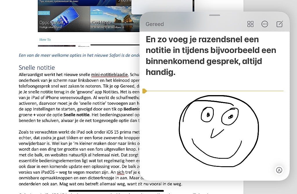 Alleraardigst werkt het nieuwe snelle mini-notitieblaadje. Schuif diagonaal vanuit de rechter onderhoek van je scherm naar linksboven en het kleinood opent. Ideaal om tijdens een telefoongesprek snel wat zaken te noteren. Tik je op Gereed, dan wordt de notitie bewaard en vind je Je snelle notitie terug in de ‘gewone’ app Notities. Het is een van die kleinigheden die ’t gebruik van je iPad of iPhone vereenvoudigen. Al werkt de schuifmethode op die iPad niet om de optie te activeren, daarvoor moet je de ‘snelle notitie’ toevoegen aan het Bedieningspaneel. Dat doe je door de app Instellingen te starten, gevolgd door een tik op Bedieningspaneel links. Tik dan rechts op de groene + voor de optie Snelle notitie. Het bedieningspaneel op je door van rechtsboven in beeld naar beneden te schuiven, alwaar je de net toegevoegde optie dan terugvindt.
