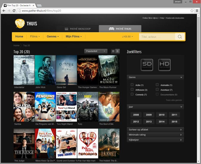 Pathé Thuis biedt een uitgebreide filmcollectie, maar alleen tegen een huur- of koopmodel per titel.