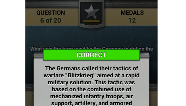 Ben je niet goed op de hoogte van wat zich heeft afgespeeld, dan kun je door deze app veel leren. De quiz kent veel vragen over de gehele breedte van de oorlog en is een van de betere quiz-apps aanwezig in de Play Store en App Store, mede doordat je beloond wordt in medailles op basis van je kennisvaardigheid.