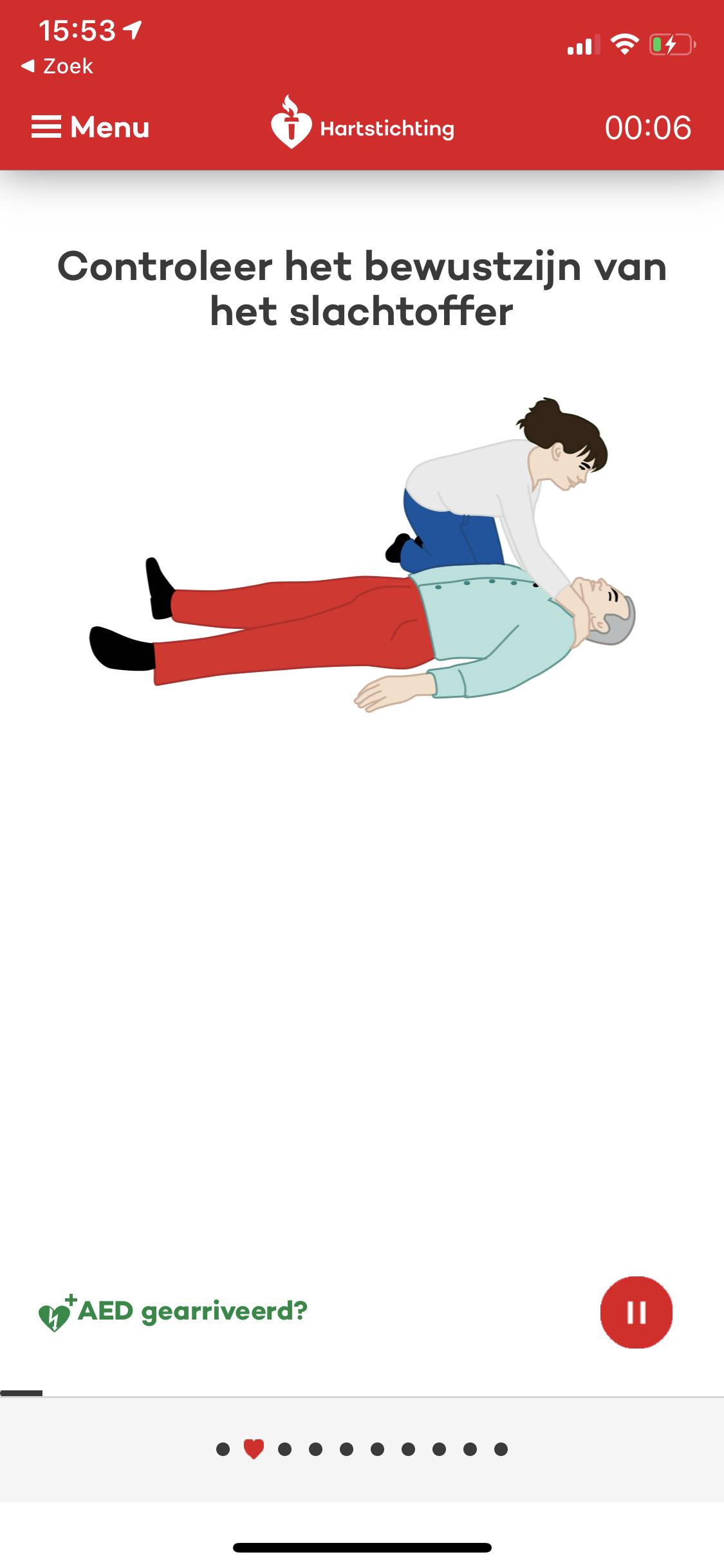 Voor de tweede situatie is er de knop Nu reanimeren, die wat ons betreft wel wat groter had gemogen. Met één druk op de knop zet je het volume van je toestel op de hoogste stand, waarna je aan de slag kunt met behulp van audio-instructies. Je hoeft dus niet naar je telefoonscherm te kijken en kunt je volledig richten op het reanimatieproces.