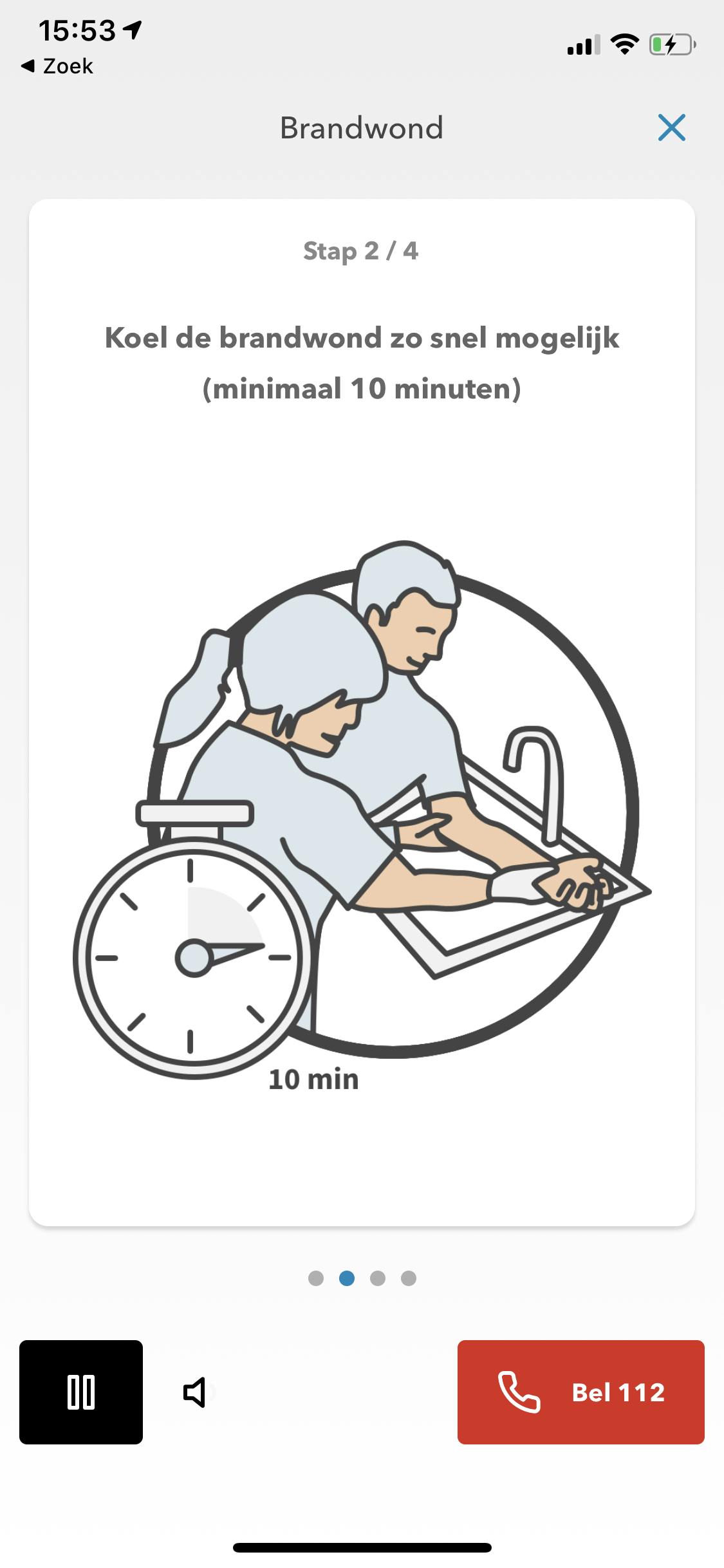 De indeling van de app is heel prettig, met bovenaan de meest dringende situaties die kunnen voorkomen (zoals hevig bloeden, bewusteloosheid, niet meer ademen en brandwonden) en daarnaast een zoekveld, zodat je ook kunt zoeken naar een andere situatie die zich op dat moment voordoet. Net als bij de app van de Hartstichting, kun je een audio-instructie inschakelen waarna je het toestel weg kunt leggen en vervolgens hulp kunt verlenen.