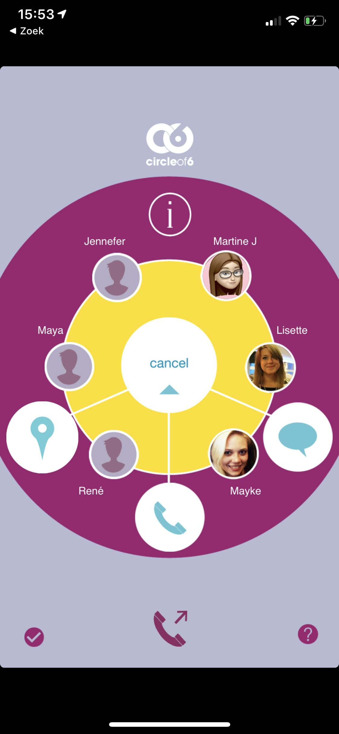 Wanneer je de app opstart, heb je de mogelijkheid om zes contactpersonen toe te voegen. Drie is in principe ook genoeg, maar de makers adviseren om er echt zes toe te voegen. Wanneer je dit hebt gedaan, verschijnt er in het midden van de cirkel: Ask my circle to… Hier heb je drie opties: een berichtje sturen met de melding dat je opgehaald moet worden, een berichtje met de vraag of ze je even willen bellen en doen alsof je per direct nodig bent (handig tijdens mislukte dates), of een berichtje met de melding dat je dringend iemand moet spreken. Is er echt iets aan de hand, dan open je de app en kies je de voor dat moment relevante optie, waarna er direct hulp wordt ingeschakeld.