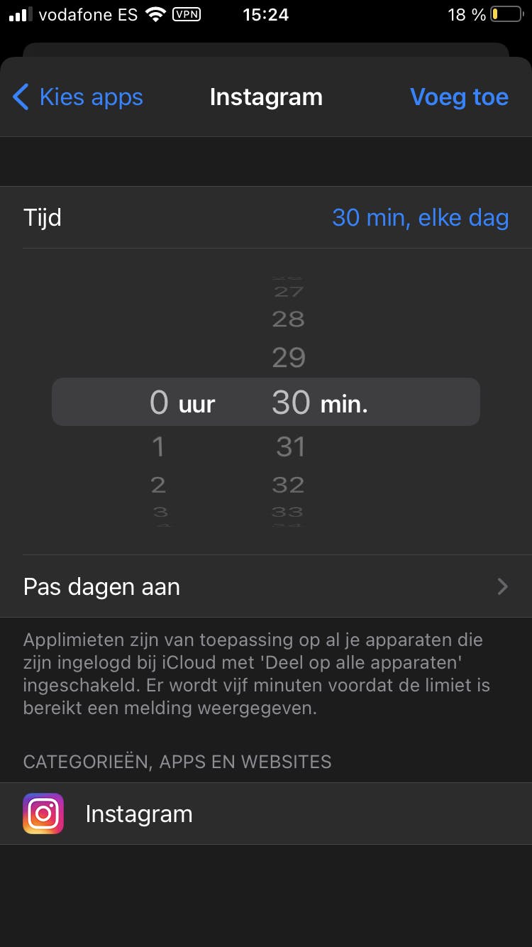 Om te weten te komen hoeveel, hoe vaak en hoelang jij op een dag je smartphone gebruikt, heeft zowel iOS als Android een handig hulpmiddel. Op je iPhone heet dit Schermtijd. Ga naar Instellingen en tik op Schermtijd. Als je deze functie nog niet hebt geactiveerd, dan tik je op Ga door en vervolgens op Dit is mijn iPhone. Je iPhone registreert vanaf nu het aantal minuten dat je per app op je smartphone bezig bent. Ook kun je limieten instellen zodat je smartphonegebruik niet uit de klauwen loopt. Tik daarvoor op Applimieten en kies voor Voeg limiet toe. iOS deelt al je apps in categorieën in. Zo kun je een limiet instellen voor bijvoorbeeld alle socialmedia-apps op je smartphone. Wil je één enkele app selecteren, dan tik je op het driehoekje aan de rechterkant en kies je een app. Kies voor Volgende en schakel het aantal minuten dat je per dag aan de app mag besteden. Tik op Pas dagen aan om per dag een andere applimiet te creëren. Tik op Voeg toe om de applimiet in te stellen. Als je over de ingestelde tijd zit, krijg je bij het openen een melding dat je je limiet hebt bereikt. Je kunt dan nog wel op Negeer limiet tikken.