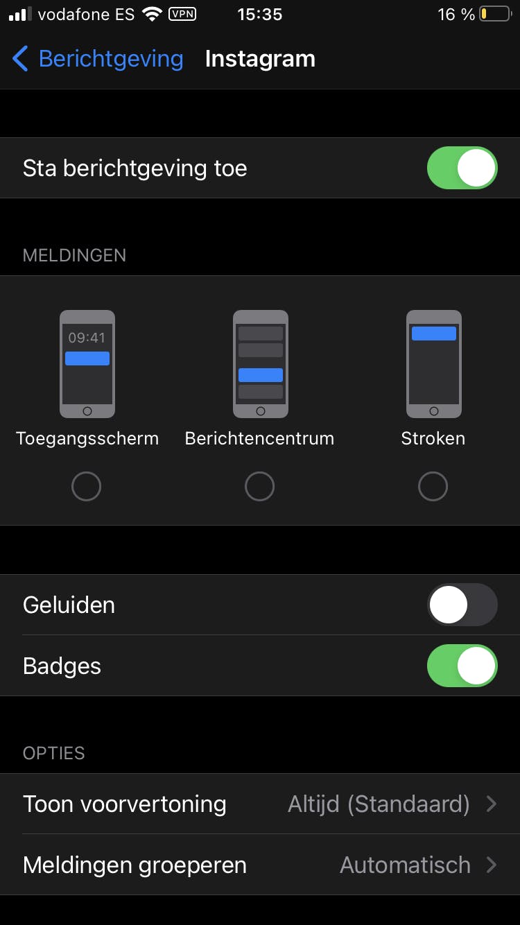 Een groot probleem is dat we gedurende de dag enorm veel informatieprikkels binnenkrijgen omdat de smartphone constant aan staat. Om de zoveel minuten krijg je wel een melding: een WhatsApp-berichtje, een nieuwe e-mail, een reactie op een van je Facebook-berichten, etc. Heb je daar last van, dan kun je de notificaties van bepaalde apps verminderen. Uiteraard wil je belangrijke berichten wel krijgen, maar een like op je Instagram-bericht bekijken kan best een paar uur wachten. In Android ga je naar Instellingen / Apps en meldingen / Meldingen. Je kunt hier bijvoorbeeld aangeven dat je geen meldingsstipje te zien wilt krijgen als er een nieuw bericht binnenkomt of dat er geen meldingen meer op het vergrendelingsscherm getoond mogen worden. Om per app te bepalen of er een melding gegeven mag worden, tik je op een app en zet je onder Meldingen het schuifje uit. In iOS ga je naar Instellingen / Berichtgeving. Per app kun je kiezen hoe meldingen worden weergegeven. Tik op de naam van de app en zet de berichtgeving compleet uit door de schuif achter Sta berichtgeving toe uit te zetten. Wil je wel notificaties ontvangen, dan kies je onder Meldingen hoe deze er precies uit moeten zien. Je kunt ervoor kiezen om geen geluid af te spelen, om geen badges (die rode rondjes in een hoek van een app-icoon) weer te geven bij nieuwe berichten of om de voorvertoning op je beginscherm niet te tonen en door achter Toon voor vertoning de optie Nooit te kiezen.