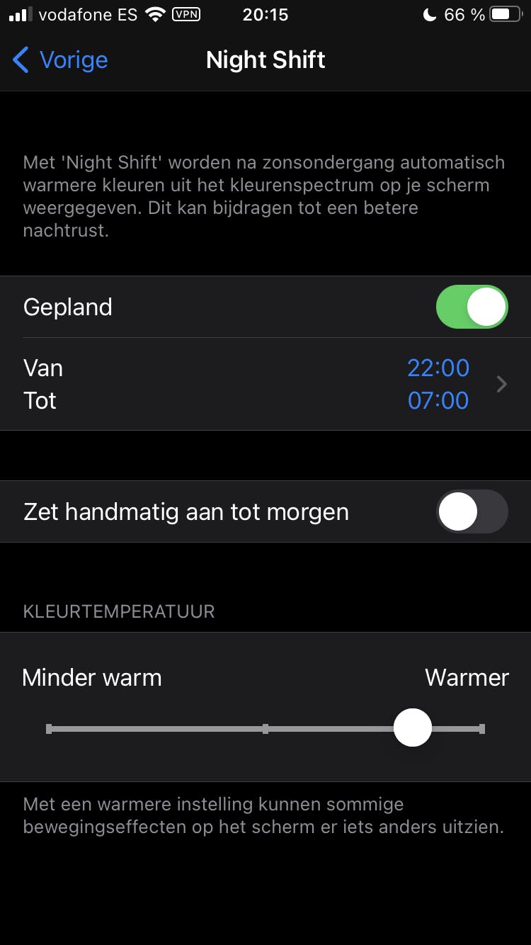 Het lijkt natuurlijk een inkoppertje, maar er valt ook veel rust te winnen door met jezelf of met je partner af te spreken dat je de smartphone op gezette tijden uitzet. Spreek bijvoorbeeld af dat je allebei na acht uur ’s avonds de smartphone uitzet en pas weer aanzet ’s ochtends nadat je hebt ontbeten. Deze kleine verandering zorgt ervoor dat je veel minder gestrest naar bed gaat of wakker wordt. Neem in ieder geval je smartphone niet mee naar bed, dit is funest om goed in slaap te kunnen. Het blauwe licht dat je smartphone uitstraalt zorgt ervoor dat je lichaam minder melatonine aanmaakt, waardoor je moeilijker in slaap komt. Is het tóch nodig dat je ’s avonds nog met je smartphone bezig bent, zorg er dan voor dat je scherm minder blauw licht produceert. In iOS activeer je de optie Night Shift bij Instellingen / Beeldscherm en helderheid. In Android kun je de nachtverlichting, al dan niet automatisch, instellen via Instellingen / Scherm.