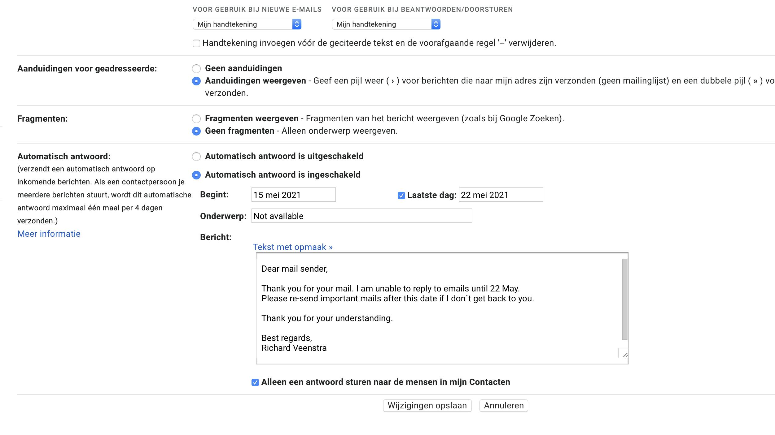 Op vakantie gaan betekent dat je niet met werk bezig hoeft te zijn. Toch openen heel veel Nederlanders hun werkmail tijdens de vakantie. Doe dat gewoon niet, en stel ruim van tevoren je collega’s op de hoogte van je vakantie en stel voor dringende zaken zo mogelijk een vervanger aan. Moet er toch iets heel belangrijks gebeuren in je vakantie, spreek dan een vaste dag en tijd af dat je je werkmail leest. Een autoreply in de trant van: ‘Ik ben met vakantie en mails worden pas na de vakantie gelezen.’ wordt tegenwoordig veel meer geaccepteerd dan een paar jaar geleden.