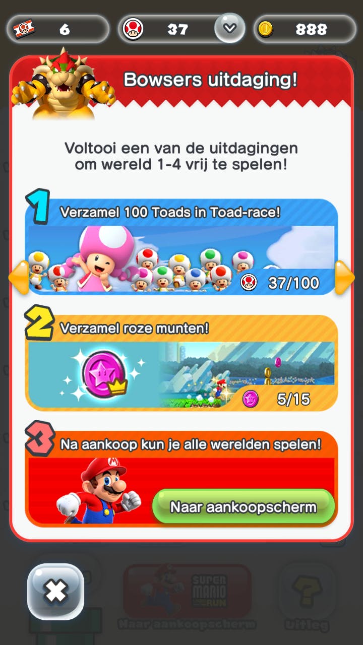 In de oude demo kon je alleen de eerste drie levels spelen, plus 30 seconden van de kerker van Bowser. In de nieuwe versie van Super Mario Run kun je deze kerker volledig spelen, mits je een opdracht naar keuze hebt uitgevoerd.