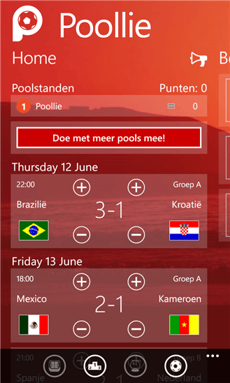 Een WK maak je nog leuker door met je vrienden te wedden op de uitkomst van de wedstrijden. En een groot voordeel: als je wedt dat je favoriete team verliest, houd je altijd iets aan een verloren wedstrijd over. Met deze app kun je een pool beginnen, tegenstanders kiezen en de uitslagen voorspellen, allemaal met je smartphone.
