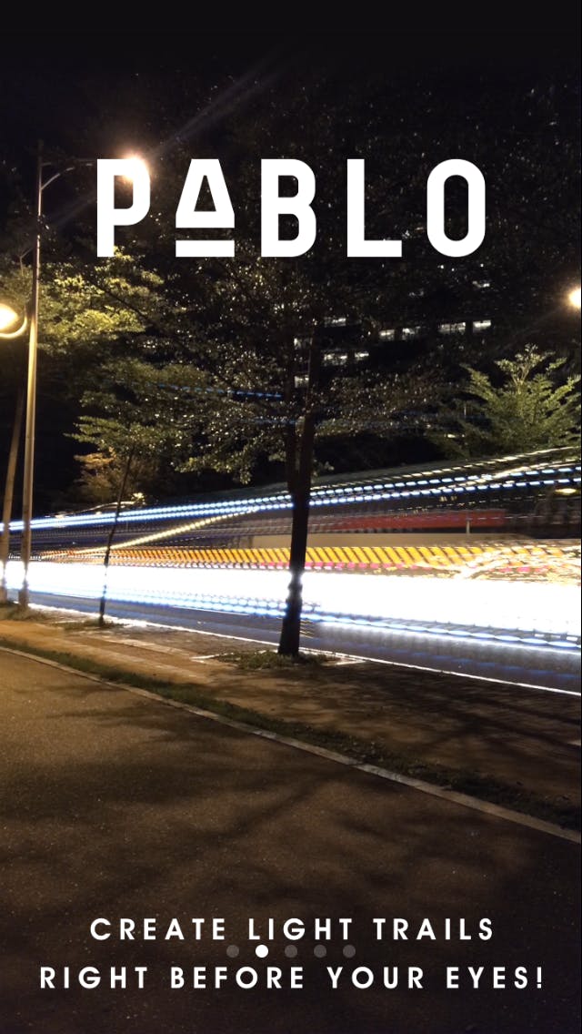 PABLO. is een zogenaamde lightpainting-app. Denk bij lightpainting aan foto’s van nachtelijke straten met een lange sluitertijd, zodat de lichten van auto’s als sfeervolle strepen getoond worden. Je smartphone is technisch niet in staat om een extreem lange sluitertijd te hebben, maar met deze app kom je dicht in de buurt. Doe het licht uit en richt je smartphone op een bewegend verlicht object. PABLO. maakt hiervan een korte video (of foto, het laatste frame) en dit levert soms erg leuke resultaten op.