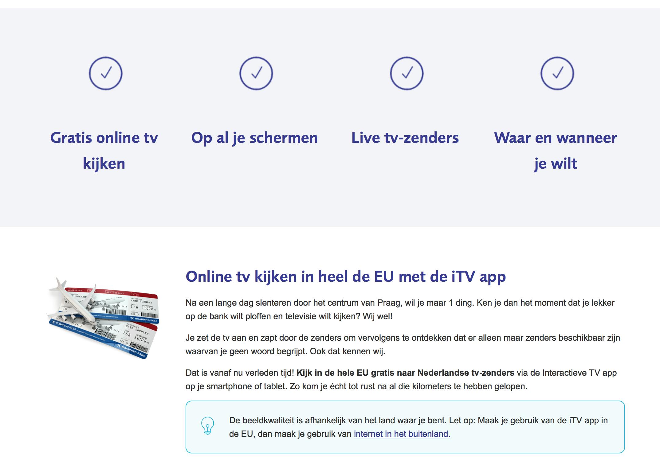 Leuk hoor, dat buitenland, maar je wil natuurlijk wel een beetje op de hoogte blijven van het Nederlandse nieuws. Vroeger was het erg lastig om op je vakantiestek Nederlandse televisie te kijken, maar tegenwoordig is dit gelukkig een stuk makkelijker geworden. Bij je kabelabonnement heb je waarschijnlijk een gratis digitaal abonnement zodat je tv op je tablet of smartphone kunt kijken. Wat er precies mogelijk is verschilt per aanbieder. Denk er wel aan dat je bij het kijken naar live tv gebruik kunt maken van je buitenlandse databundel en met een livestream kan het hard gaan met de megabytes. Het is slim om in het buitenland alleen tv te kijken als je verbinding hebt met een wifi-netwerk, of als je zeker weet dat je genoeg gigabytes kunt verbruiken in het buitenland. Heb je een abonnement op NPO Start of NLZiet, dan kun je dit aanbod ook gewoon in de EU bekijken. Voor landen buiten de EU, dus ook Zwitserland, geldt dit dus niet. Het kan wel zijn dat sommige inhoud in het buitenland niet beschikbaar is vanwege uitzendrechten.
