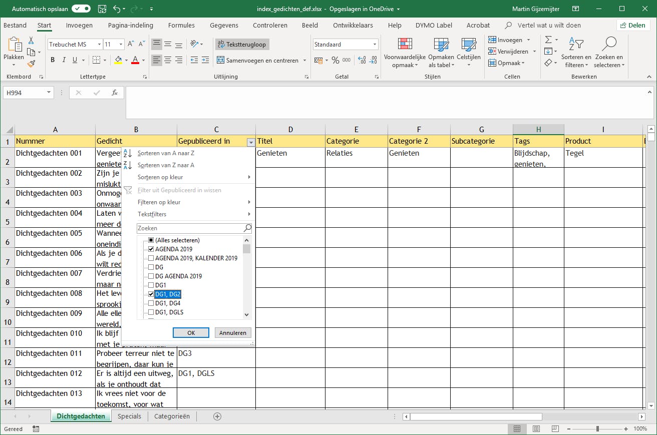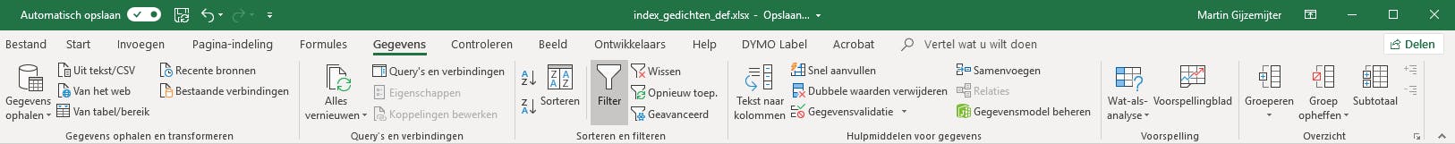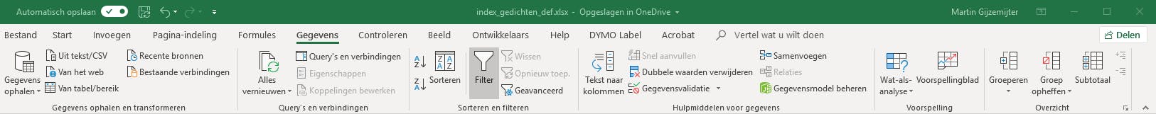 We hoeven je waarschijnlijk niet te vertellen dat je de inhoud van rijen en kolommen in Excel kunt sorteren. Naast sortering is er echter nog een superhandige methode voor het vinden van bepaalde gegevens, namelijk filtering. Met behulp van filtering kun je Excel vertellen dat het cellen met een bepaalde inhoud moet verbergen, of juist alleen die inhoud moet tonen. Op die manier kun je heel eenvoudig vinden wat je zoekt. Neem bijvoorbeeld deze Excel sheet, met daarin een reeks gedichten en de bundel waarin ze zijn opgenomen. Stel dat we nu alleen alle gedichten willen zien die zijn opgenomen in een bepaalde bundel. In dat geval selecteren we de rij met daarin de titels van de bundels en klikken we vervolgens op de knop Filter, in het tabblad Gegevens in het lint bovenin. Bovenaan de geselecteerde kolom verschijnt nu een uitklapmenu. Wanneer je hierop klikt, kun je precies aangeven welke informatie je getoond of juist verborgen wil hebben. Zo kun je dus heel eenvoudig aangeven dat je alleen de inhoud van een bepaalde titel wilt zien, en word je niet afgeleid door alle andere informatie die je niet nodig hebt.