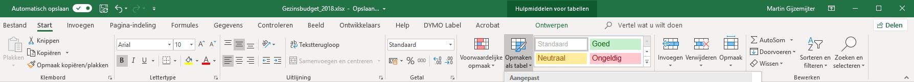 Je hebt ze waarschijnlijk wel eens voorbij zien komen, van die tabellen die prachtig zijn opgemaakt, met de koprij voorzien van een opvallende kleur, en vervolgens de rijen daaronder om en om van een andere kleur, zodat je de inhoud van de rijen eenvoudig uit elkaar kunt halen. Wellicht heb je ook wel eens geprobeerd om zo’n tabel na te maken, en heb je alle rijen één voor één een andere kleur gegeven, om vervolgens te ontdekken dat dit helemaal de soep in draait wanneer je de inhoud gaat knippen en plakken, rijen toevoegt, verwijdert, enzovoort. Frustrerend, maar bovendien onnodig, want Excel heeft een ingebouwde functie die dit voor je kan doen. Het enige dat je hoeft te doen is de hele inhoud van het tabel (het cellenbereik) te selecteren, en vervolgens te klikken op de knop Opmaken als tabel, in het vak Stijlen in het tabblad Start. Je ziet nu een reeks stijlen die je kunt toepassen aan je tabel. Door je muis over de stijlen te bewegen, zie je direct hoe het er uit komt te zien. En het beste van alles: wanneer je een rij verwijdert, heeft dit geen invloed op de opmaak, de kleuren van de rijen blijven netjes om en om.