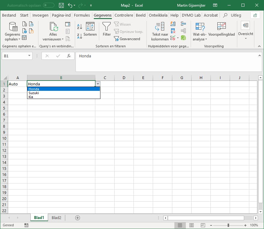 Contextgevoelige uitklapmenu’s zijn menu’s waarvan de inhoud verandert aan de hand van wat er in een ander uitklapmenu is geselecteerd. Stel dat je een Excel-sheet maakt waarin mensen moeten beantwoorden of ze liever reizen per fiets of per auto, en dat je vervolgens wilt weten welk merk ze bezitten. Maak een nieuw document aan in Excel en maak direct een nieuw werkblad aan. In dit werkblad zet je in cel A1 het woord vervoersmiddelen en daaronder de opties (A2 fiets, A3 auto), in cel B1 zet je het woord auto en daaronder de merken (bijv. B2 Honda, B3, Suzuki, B4 Kia) en in cel C1 zet je het woord fietsen en daaronder de merken fiets (bijv. C2 Batavus, C3 Gazelle, C4 Giant. Selecteer alle cellen en klik in het tabblad Formules op Maken o.b.v. selectie en vink alleen Bovenste rij aan. Ga vervolgens terug naar je eerste werkblad en klik in cel A1 (hier plaatsen we het eerste uitklapmenu). Klik op Gegevensvalidatie in het tabblad Gegevens en kies voor Lijst en vul bij Bron in: =Vervoersmiddel. Vervolgens klik je op cel B1 en daarna wederom op Gegevensvalidatie. Ditmaal geef je echter het volgende in bij Bron: =indirect(A1). Hiermee geef je aan dat de inhoud van uitklapmenu B1 afhankelijk is van de keuze die gemaakt wordt in uitklapmenu A1. Je kunt hierin zo ver gaan als je wilt.